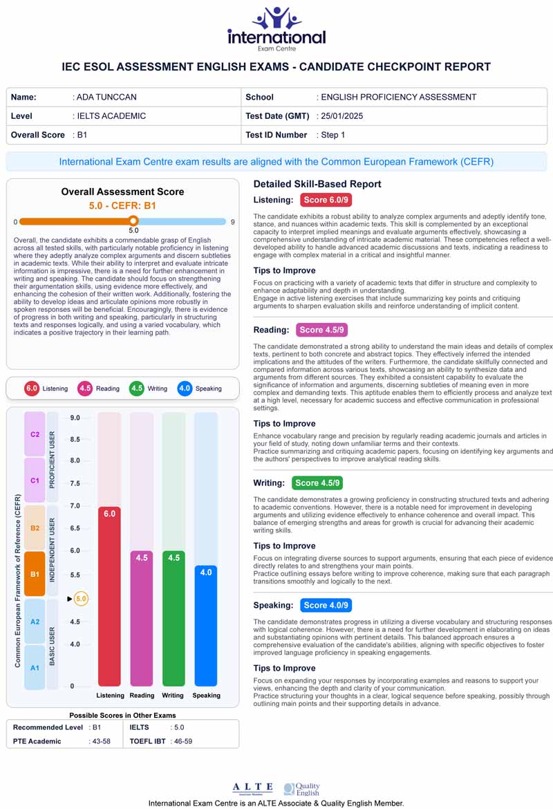 ✅ Beceri analizi ve gelişim fırsatı: Dinleme (Listening), Okuma (Reading), Yazma (Writing) ve Konuşma (Speaking) bölümlerinde sınav deneyimi kazanarak, hangi alanlarda eksikleriniz olduğunu tespit edebilirsiniz.