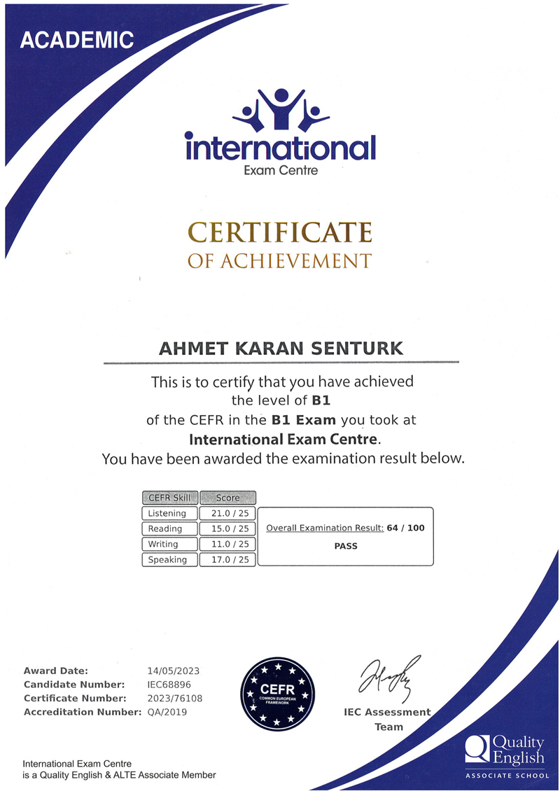 • Uluslararası Üye Statüsü: IEC, Quality English üyesi ve ALTE (Association of Language Testers in Europe) Bağlı Üyesidir (Associate Member).