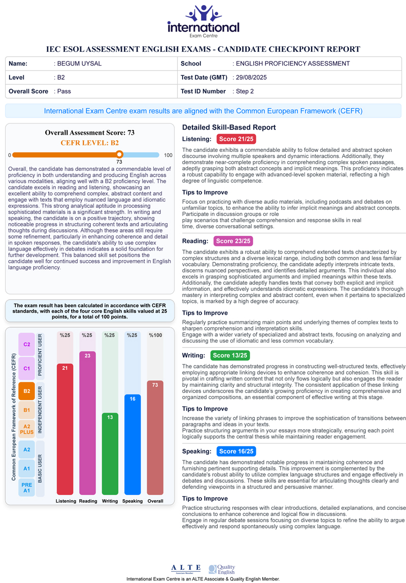 • CEFR Standartlarına Uyum: Sınavlar Avrupa’da kabul görmüş ölçme kriterleri ile hazırlanır.