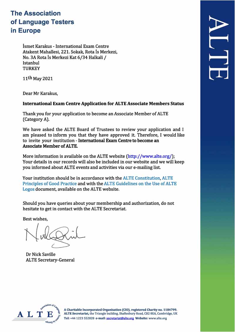 International Exam Centre, ALTE’nin Bağlı Üyesi (Associate Member) olarak dil değerlendirmesinde yüksek standartları benimsemektedir.